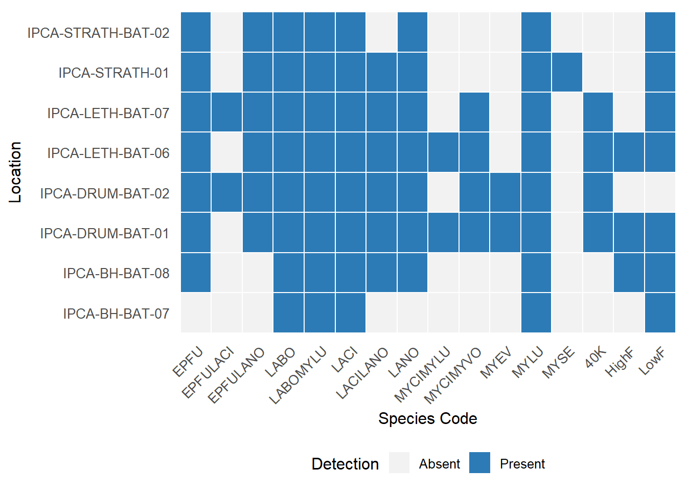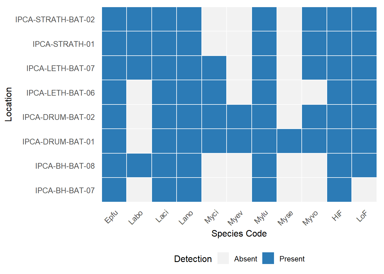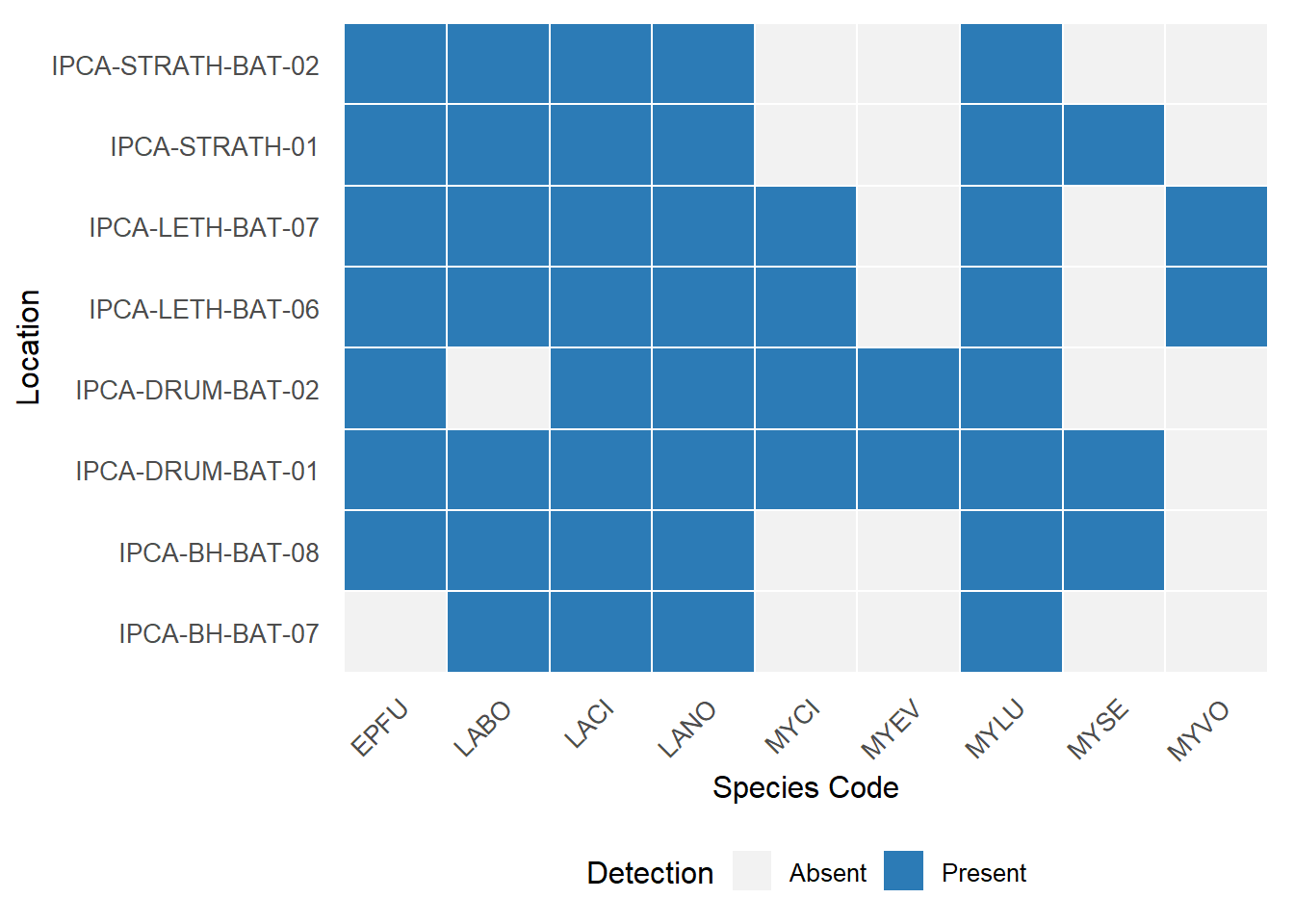 Following manual verification, hoary bats(Lasiurus cinereus), eastern red bats (Lasirus borealis), and little brown Myotis (Myotis lucifugus) were detected at all surveyed locations (Figure 1). Silver-haired bats (Lasionycteris noctivagans) were detected at all sites except IPCA-BH-BAT-07; however, their presence at this site remains plausible given regional distributions. Northern Myotis (Myotis septentrionalis) were detected only at the IPCA-STRATH-01 location. As this species is challenging to detect using acoustic methods, non-detection at other sites should not be interpreted as evidence of true absence.
