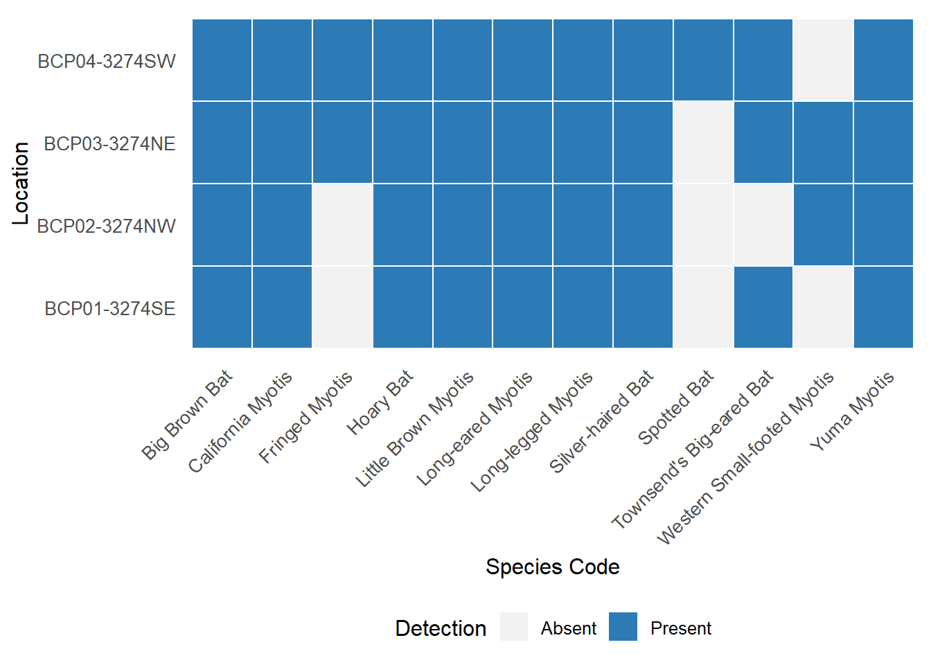 Full-spectrum recordings from the sampling periods were collected and processed using two automatic classifiers: Kaleidoscope’s Bats of North America 5.4.0 classifier and Sonobat 3.0’s northeastern British Columbia classifier. Manual verification is currently underway, and results can be shared upon request.