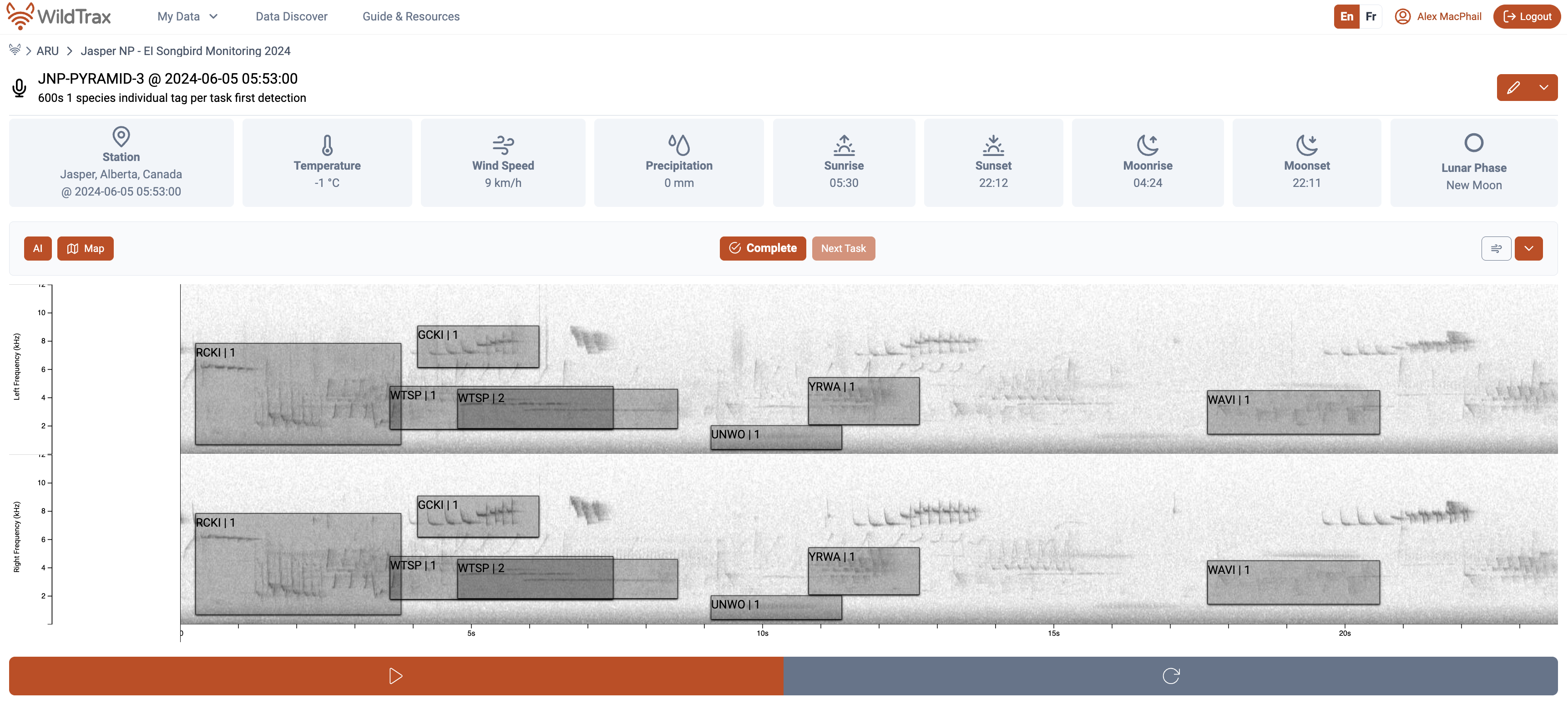 Recordings were clipped and organized to only include the 10-minute count. Before adopting WildTrax in 2021, processing analysts excluded the initial 20 seconds to 1.5 minutes of recordings to reduce human impact on detection probability, then logged the first detection time per species. Recordings are now uploaded as clean 10-minute files with the voice note and observer notes removed. In WildTrax, individuals were counted by users scanning both the spectrogram and listening to the audio output (MacPhail et al. (2026)). Tags were then drawn to encompass the signal within the methods indicated in each project (see Table 2). Transcribers also had site photos available to optimize their species identification by having habitat context while processing.