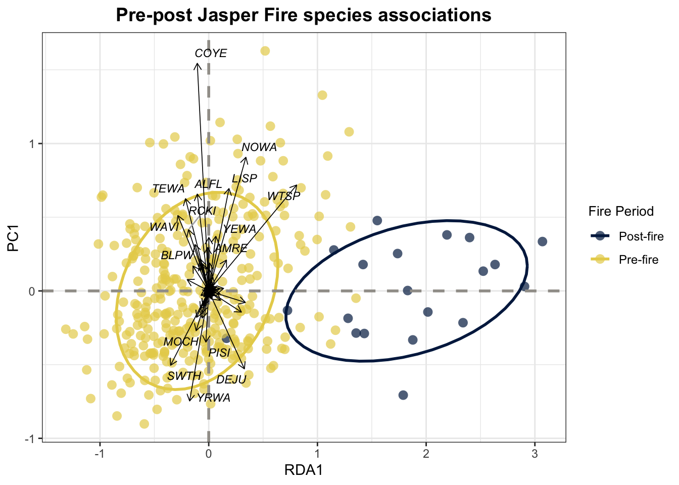 The pre-fire and 1-year post-fire points occupy overlapping but shifted regions indicating that the fire did not completely replace the community but it reorganized species composition in a consistent direction which is a classic disturbance-driven compositional shift and not a collapse or a reset. In Figure 9, the post-fire ellipse is significantly shifted indicating greater variability among sites after fire and more heterogeneous species assemblages. Species vectors identified taxa contributing most strongly to these differences, suggesting that the Jasper Wildfire altered species associations rather than uniformly affecting overall abundance. Dark-eyed Junco (Junco hyemalis, DEJU) shows a strong directional association with post-fire sites (they tolerate reduced canopy cover and more simplified forest structure), while Swainson’s Thrush (Catharus ustulatus, SWTH), Warbling Vireo (Vireo gilvus, WAVI), and Tennessee Warbler (Leiothlypis peregrina, TEWA) were strongly associated with pre-fire assemblages, and are generally associated with intact forest canopy and vertical foliage structure. This indicates that structurally complex forest conditions were an important component of bird community composition prior to the Jasper Fire.