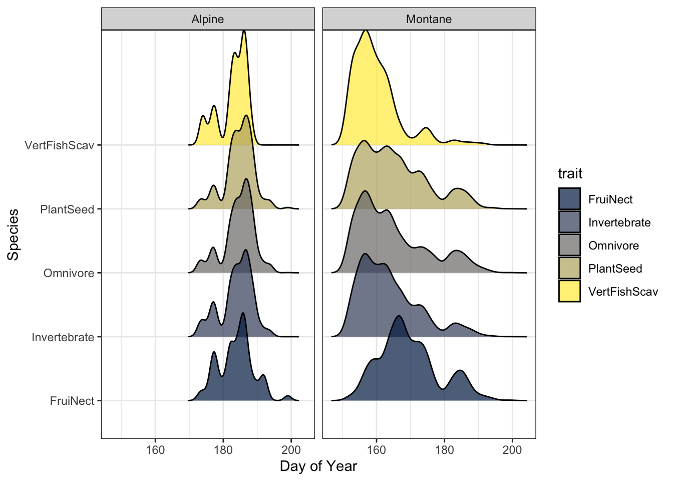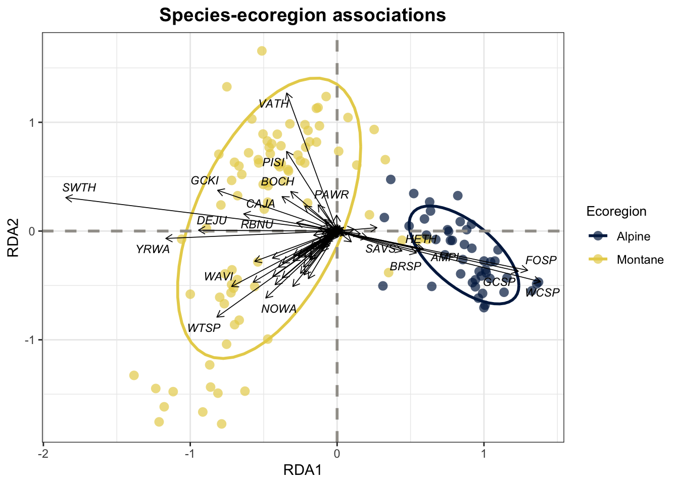 package (Oksanen et al. (2025)) to quantify the variation in community composition explained by ecoregions and to visualize species–ecoregion relationships with ordination plots (C. Radhakrishna Rao (1964)). Species‑level observations were aggregated into a species‑by‑location matrix, with abundances recorded as the maximum count of each species at each location. Ecoregions were categorized into Alpine and Montane with the Montaine ecoregions that can be further sub-divided into Upper Subalpine, Lower Subalpine, and Montane proper ecozones for all subsequent analyses. Differences in composition between Alpine and Montane groups were tested using permutational multivariate analysis of variance (PERMANOVA; Anderson (2001)) on Bray–Curtis dissimilarities with 999 permutations under a reduced model.