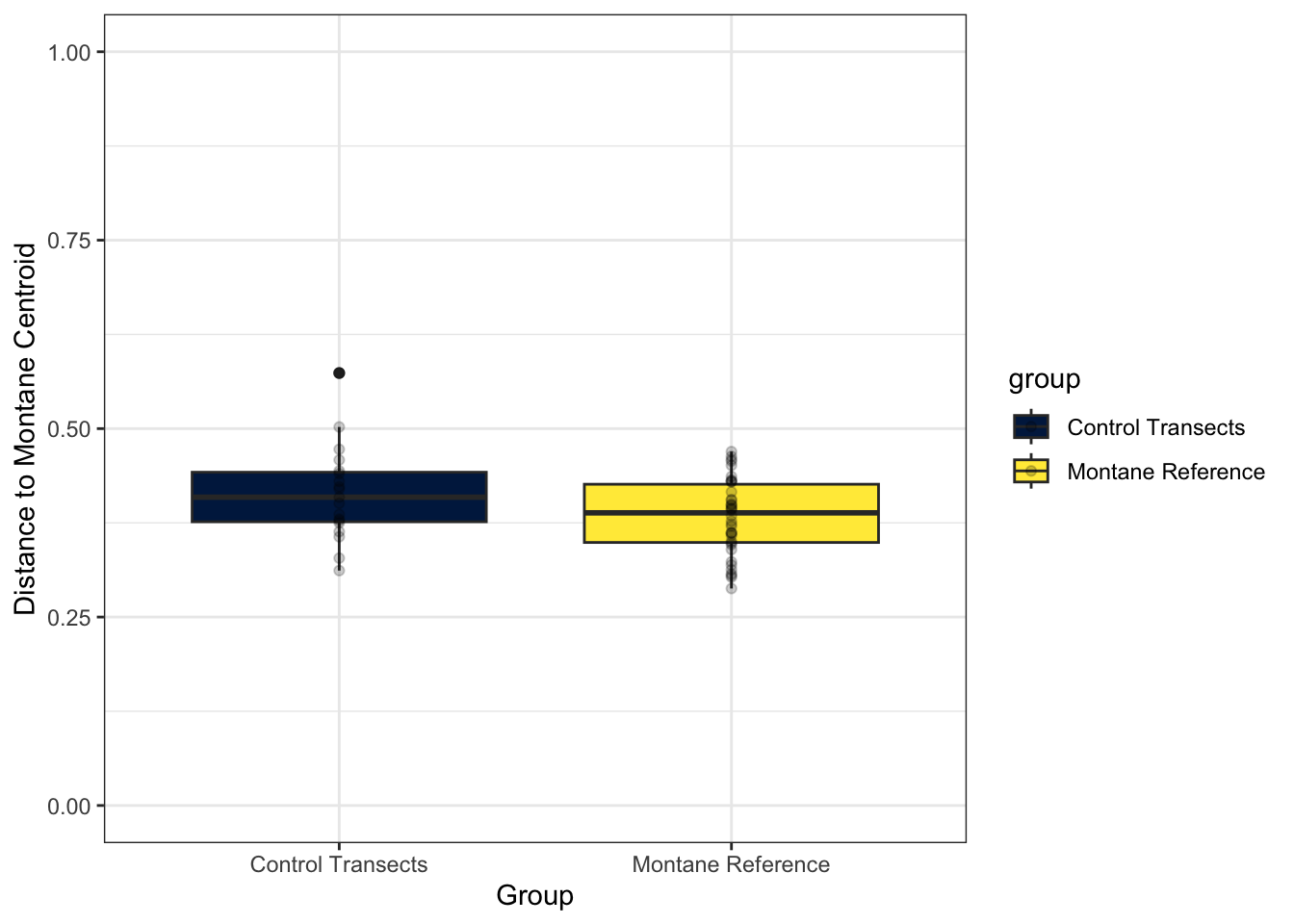 Multivariate dispersion differed significantly between control and reference montane transects (PERMDISP; F = 4.05, p = 0.05). Although control transects exhibited a slightly higher median distance (mean = 0.421), their distributions overlapped strongly with those of the true montane reference transects (Mean = 0.415), and there was no evidence of increased dispersion or outliers unique to replacement sites (Figure X). This suggests that replacement transects are not compositionally distinct from existing montane transects and fall within the natural variability of montane bird communities already sampled. Consequently, the addition of replacement sites is unlikely to introduce systematic bias, supporting their use as valid representatives of montane bird communities for pre- and post-fire comparisons.