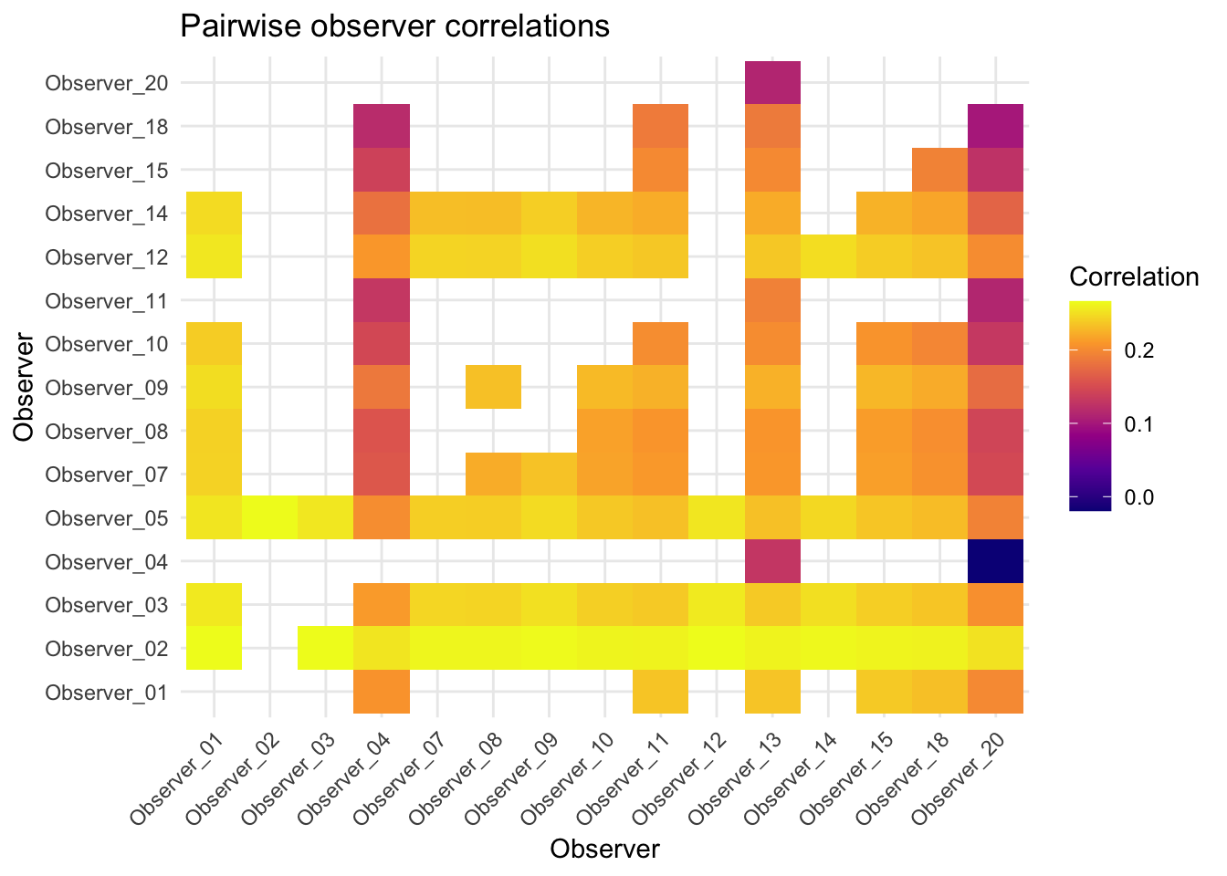 First, to quantify consistency in abundance estimates, we calculated pairwise Pearson correlations between all individual observers. These relationships were visualized using a heatmap to identify any systematic deviations in counting between legacy contractors and current WildTrax observers. Figure 3 indicates that there is general consistency in abundance counts, but not high reliability between observers (e.g., some observers are more generous with counts than others) indicating there may be a bias - OR BECAUSE METHOD CHANGED - e.g., re-start between bins, cap on counts.