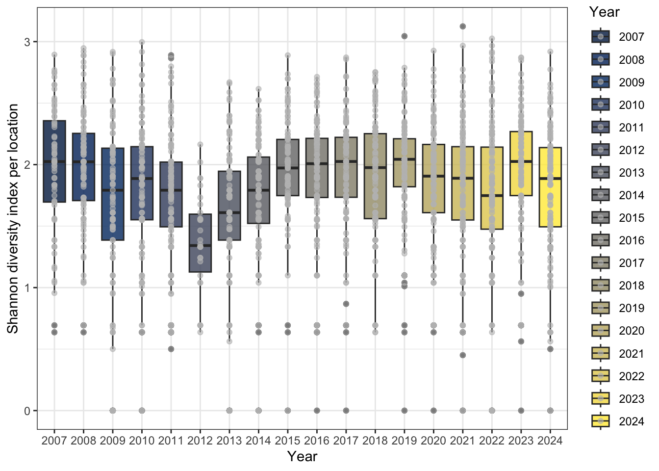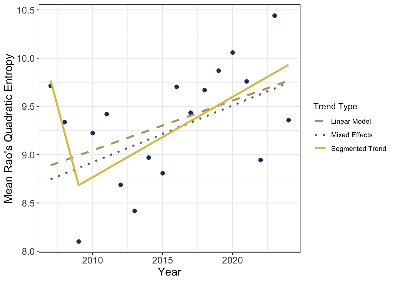 Functional diversity was quantified using Rao’s Q (C. R. Rao (1982); Laliberté and Legendre (2010)) via the dbFD() function in the FD package (Laliberté, Legendre, and Shipley (2014)). To assess temporal changes in guild-level trait diversity, we applied linear, mixed-effects, and segmented models. We also summarized raw species richness—the number of unique species—per location and plotted its change over time (Figure 10), complemented by annual estimates of Shannon’s diversity index, which integrates both species richness and evenness, to capture broader shifts in community structure (Figure 11).