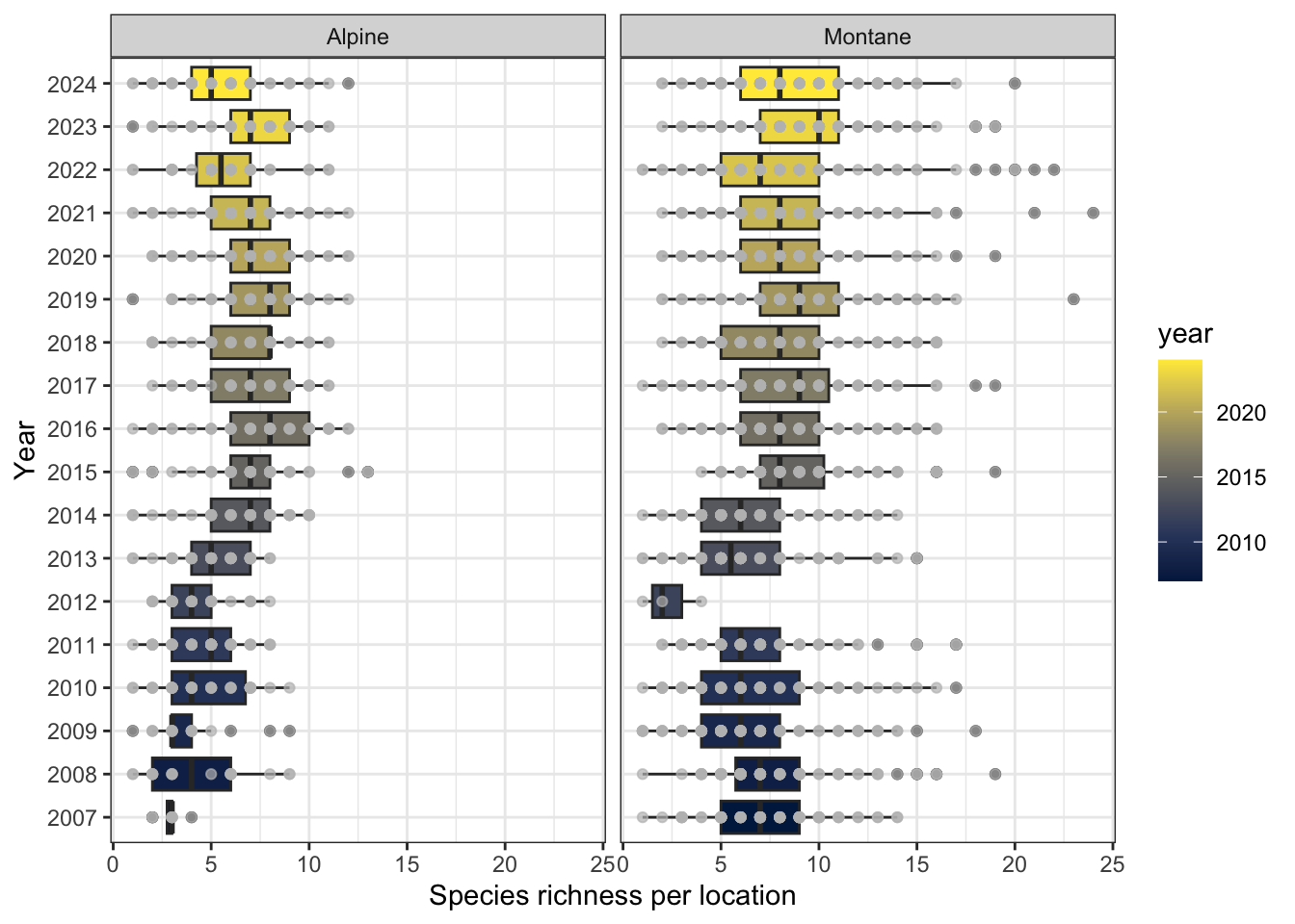 Activity patterns across nesting, dietary and migratory guilds are illustrated in ?@fig-spp-nesting onwards. A notable pattern emerges across all four guilds of the proportion of tags detected being detected later in the alpine ecoregion compared to the montane ecoregion. Species richness per location is at Figure 10 and Shannon’s diversity index over years at Figure 11. Overall, both richness and diversity were stable across years. Rao’s Q averaged between about 8.2 and 10.5 across survey locations, with a clear upward tendency over time (Figure 9). The non‑parametric Mann–Kendall test gave a Kendall’s τ of 0.32 (p ≈ 0.07), indicating a positive but marginally non‑significant monotonic increase in functional diversity. A simple linear regression of mean Rao’s Q against year yielded a slope of 0.051 units per year (p ≈ 0.06), again suggesting an upward trend that narrowly misses the conventional 0.05 significance threshold. When we account for repeated measures at each location via a mixed‑effects model (random intercepts by location), the year effect becomes highly significant (slope = 0.058 Rao’s Q units per year; t ≈ 4.3), demonstrating that functional diversity has increases when location‑level variation is considered. Finally, breakpoint analysis identifies a shift around 2009, suggesting that functional diversity was relatively low and stable from 2007–2009, then rose to more variable but generally higher values from 2010 onward.
