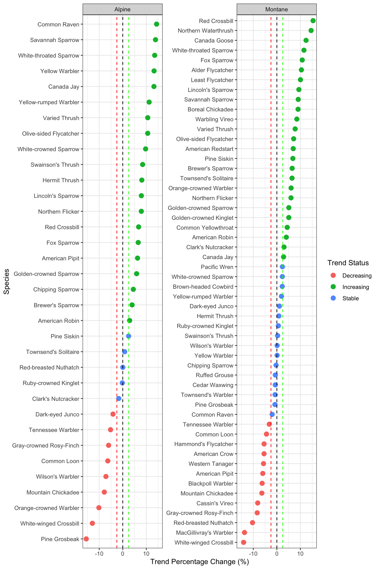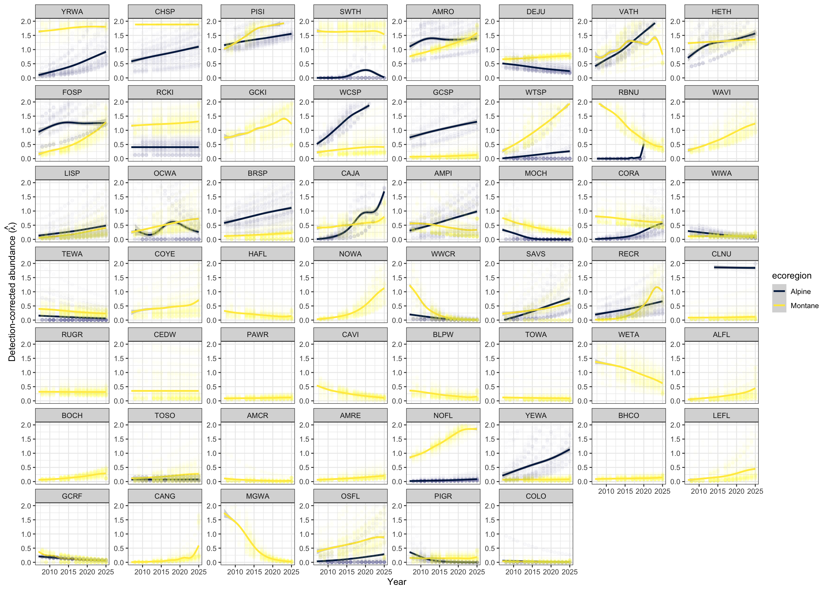 - Report on trends in bird abundance by species and by guild in the montane (forest indicator) and alpine (alpine indicator) ecoregions, incorporating time-to-first-detection analysis