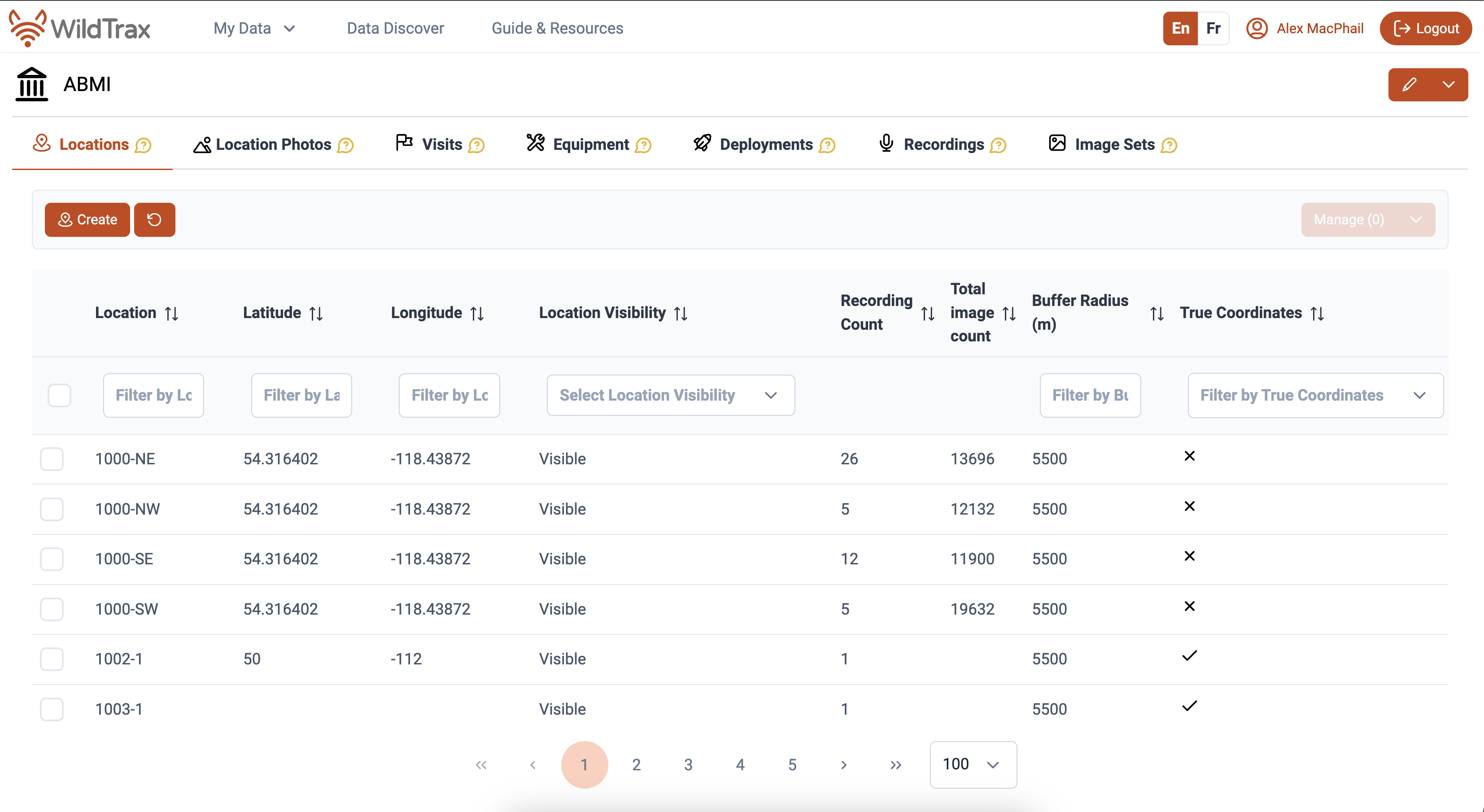 Consistent site naming is essential for linking repeat surveys across years and ensuring data loads cleanly into WildTrax. Location names should follow a stable, documented convention that persists across seasons and years (e.g., EINP-MOS-3, AC-C2). This avoids fragmentation caused by ad-hoc renaming and allows records from different sampling periods to be reliably joined. Where possible, names should use a hierarchical structure, moving from broad to specific (e.g., project or region → sub-site → point → treatment). This structure supports automated grouping, summarization, and analysis without manual reconciliation. Do not include burn type, year, or post-burn state in the location name, as this information is managed separately in metadata. Including it directly in the name can create inconsistencies within WildTrax as different location names would be generated. However, each location can still store spatial coordinates, and locations can be merged as needed within the system.