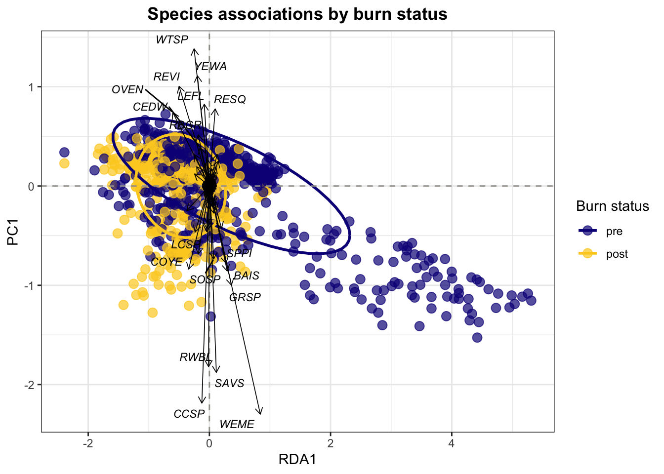 Over the past years, Parks Canada staff have conducted bird surveys within prescribed fire areas to assess how migratory bird communities respond to fire. This dataset provides an opportunity to examine changes in bird species composition, functional communities and richness before and after prescribed fire, as well as to evaluate variation across parks and fire events. The primary objective of this report is to describe and compare migratory bird communities before and after prescribed fire and to assess whether detectable differences are evident in species-level and community-level metrics. A secondary objective is to evaluate the sampling strategy used, including its capacity to characterize bird communities and its statistical power to detect or model changes associated with prescribed fire. The results of this work will support Parks Canada in interpreting the ecological outcomes of prescribed fire and in refining future monitoring and fire management practices.