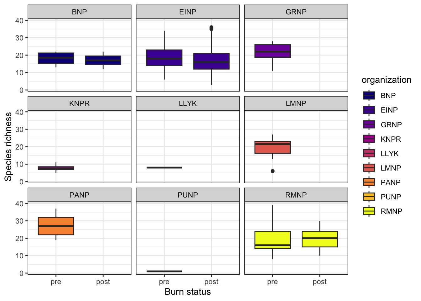 A summary of locations and covariates collected can be found in Table 2. Species richness overall did not change significantly following burns. Paired pre- and post-burn comparisons across locations showed no systematic increase or decrease in richness (Wilcoxon signed-rank test, V = 19.5, p = 0.44).