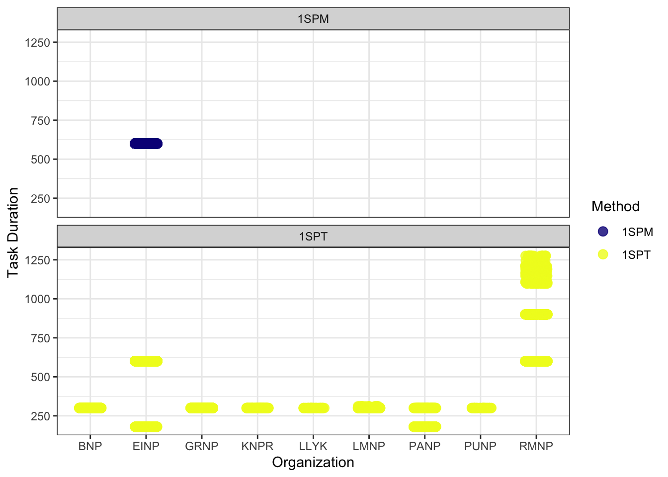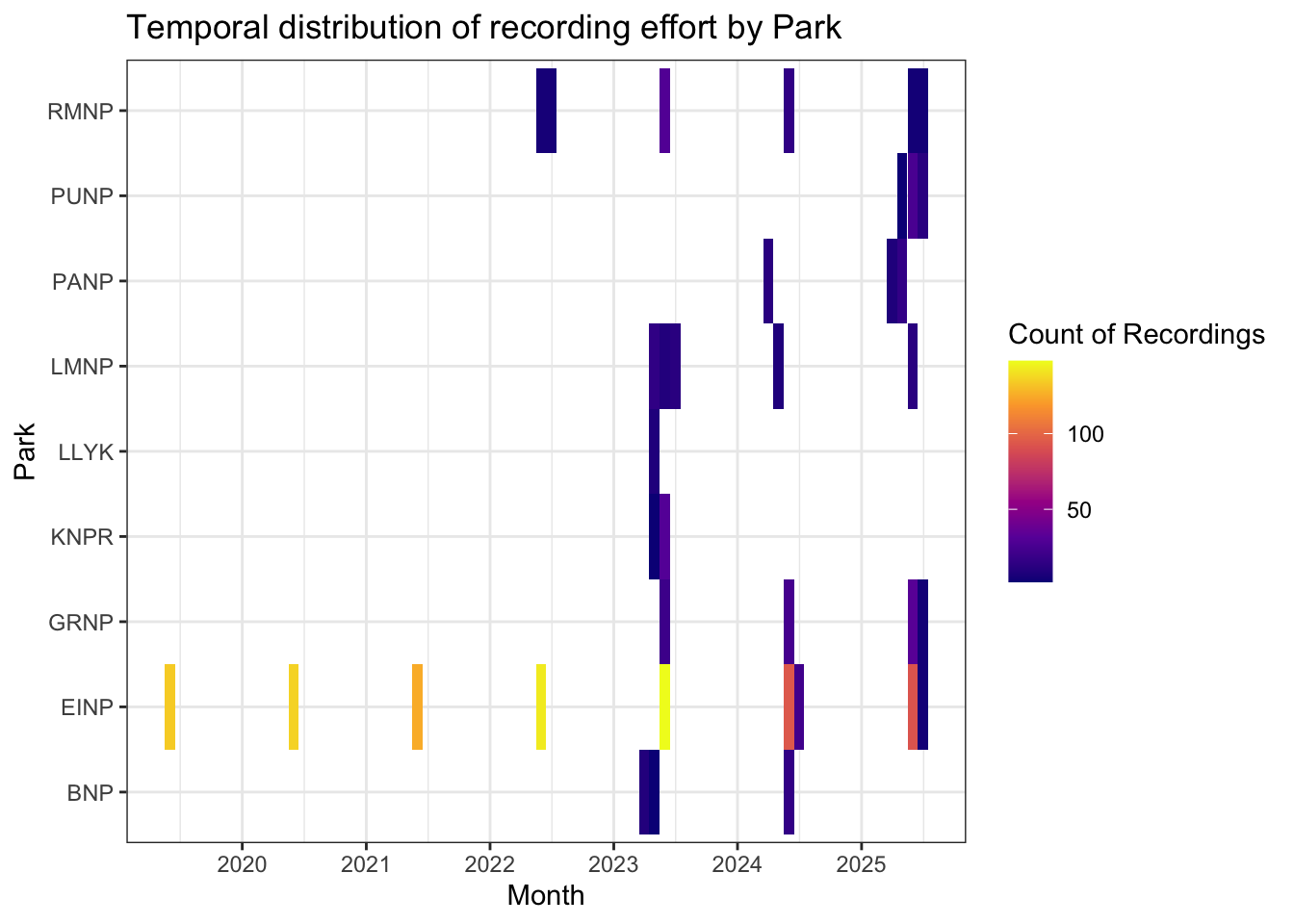 The principal goal for data processing was to describe the acoustic community of species heard at locations while choosing a large enough subset of recordings for analyses. Data processing was completed in WildTrax with tags made using count-removal (see Farnsworth et al. (2002), Sólymos et al. (2018)) where tags are only made at the time of first detection of each individual heard on the recordings (MacPhail et al. 2026 In Review). Multiple recording lengths were used in analysis relative to each national park (Figure 3) We also verified that all tags that were created were checked by a second observer (n = 59.83) to ensure accuracy of detections. If amphibians were detected, abundance was estimated at the time of first detection using the North American Amphibian Monitoring Program with abundance of species being estimated on the scale of “calling intensity index” (CI) of 1 - 3. Mammals such as Red Squirrel, were also noted on the recordings. After the data are processed in WildTrax, the wildrtrax package is use to download the data into a standard format prepared for analysis. The wt_download_report() function downloads the data directly to a R framework for easy manipulation (see wildrtrax APIs).
