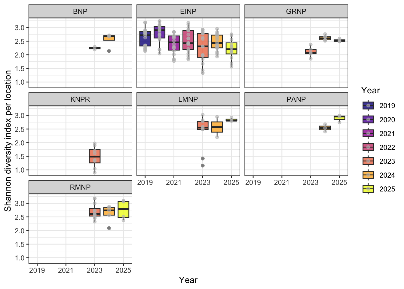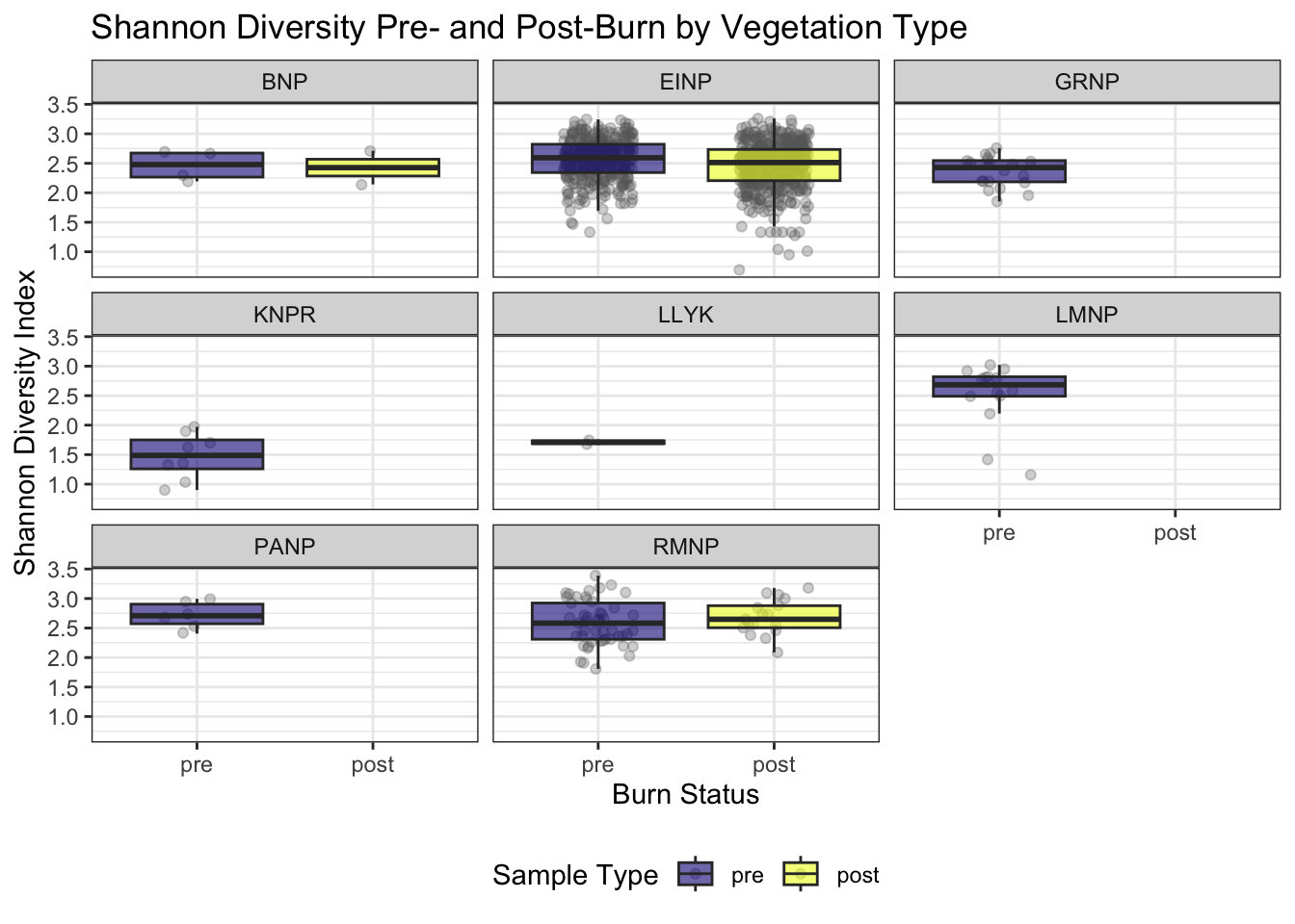 We calculated the Shannon diversity index for each surveyed location and year to quantify species diversity. Only vertebrate species (excluding mammals, amphibians, insects, abiotic, and unknown detections) were retained. For each recording, the maximum observed abundance per species was recorded. Data were then aggregated by location and year to produce a species-by-location abundance matrix. Shannon diversity was calculated from these totals using the diversity function, and results were combined with vegetation type metadata for each site. Diversity patterns across years were visualized and grouped by Park (Figure 7) Shannon diversity index was compared between pre-burn and post-burn surveys at each location. Only sites with known vegetation type and sample type were included (Figure 8).