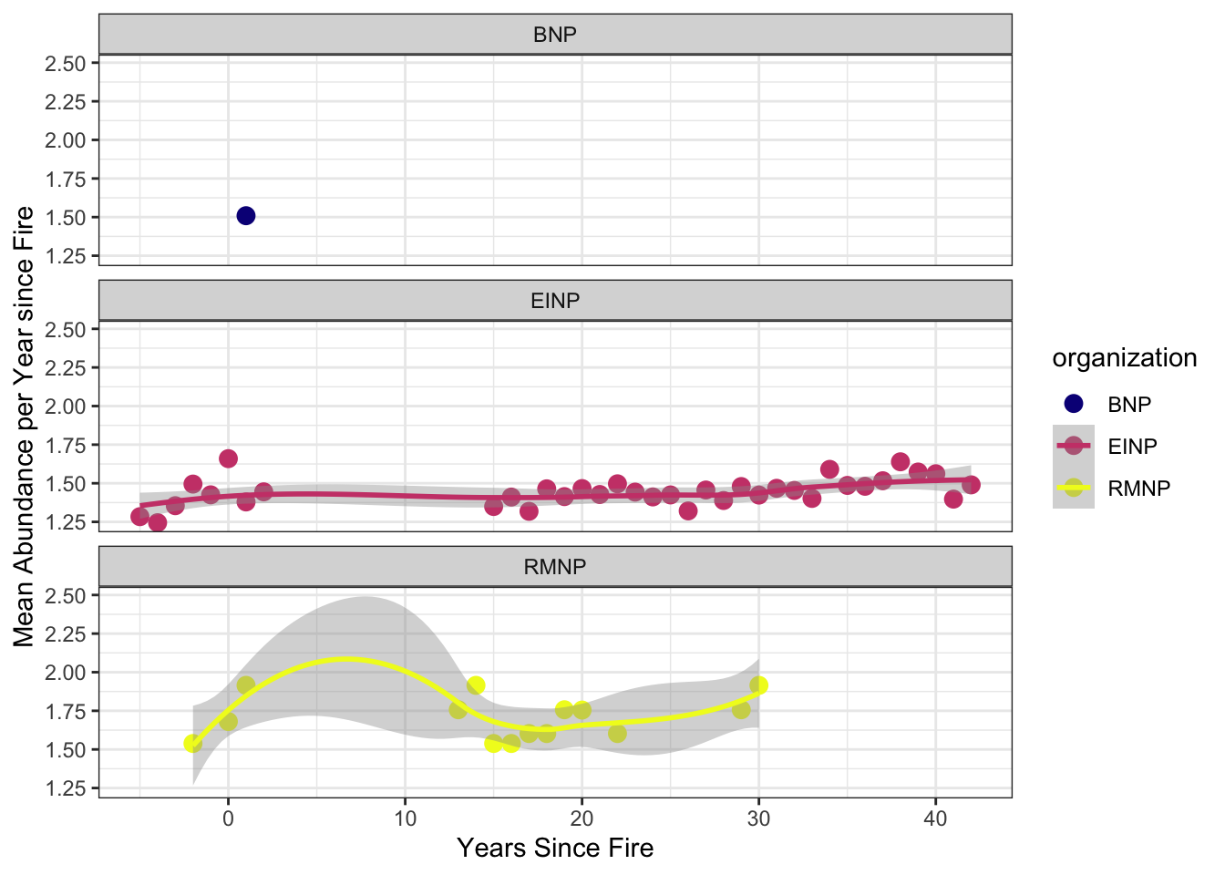 We examined how species abundance varied with time since fire and site characteristics (Figure 5). Data were filtered to include relevant columns and distinct observations of species and abundance. For visualization, total and mean species abundances were summarized by years since fire. To test for statistical effects, a generalized linear model (GLM) with a Poisson distribution was fit, using individual abundance as the response variable and years since fire, vegetation type, and fire frequency as explanatory variables. This approach allowed us to assess the influence of fire history and site characteristics on species abundance.